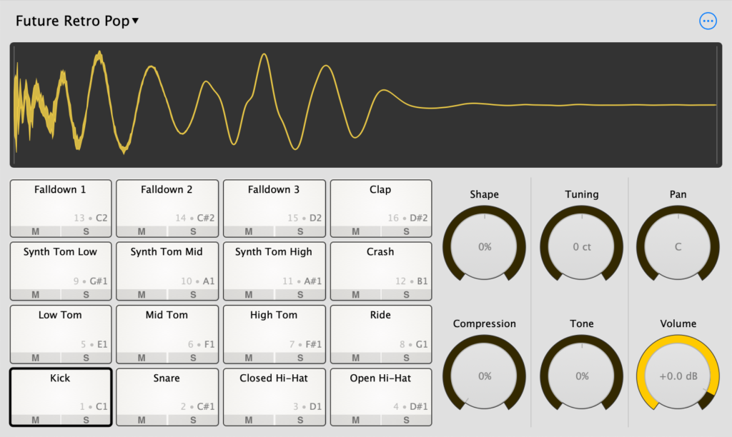 - Full acoustic drum kit with multiple articulations