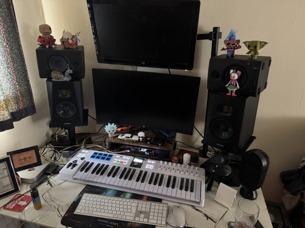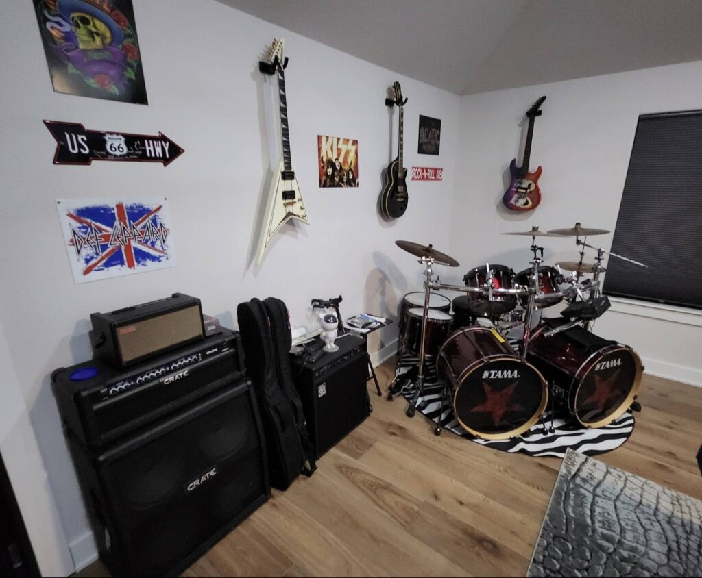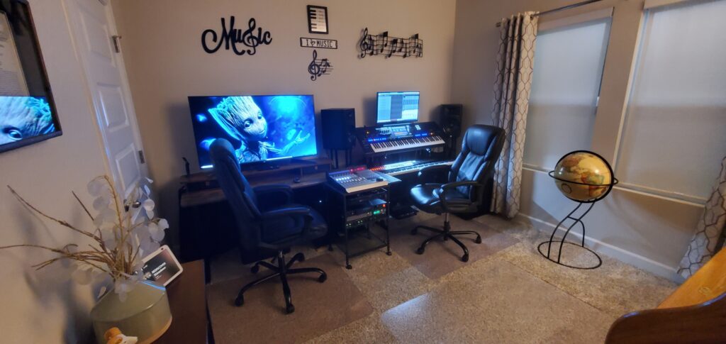 This setup focuses on visual balance and comfort while keeping music gear easy to reach. Soft colors, clean lines, and intentional decor help the room feel inviting.