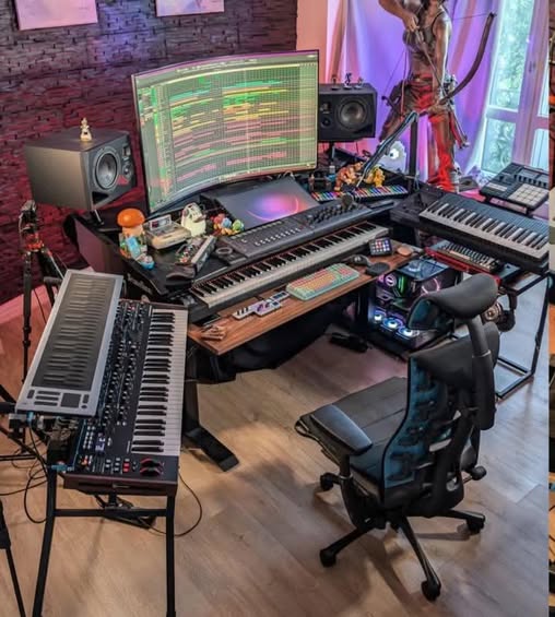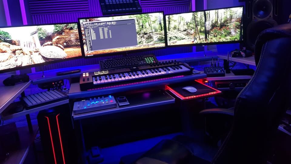 Look out for how different light sources can change the mood of your entire studio. This layout may include RGB strips or warm lamps to create a specific creative atmosphere. It’s also clear that good lighting helps reduce eye strain during late-night editing marathons. Placing lights behind your monitors can even help the screen colors pop a bit more.