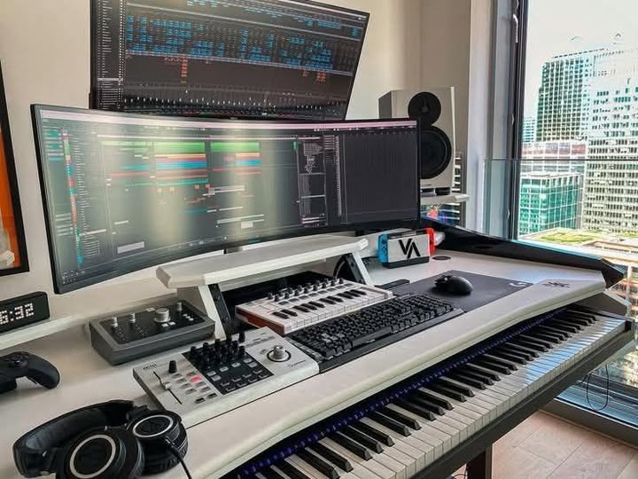 Now, if all your gear is digital, you can afford to have a very sleek layout. This setup commonly features a single large ultrawide monitor to replace multiple smaller screens. It is also important to have a high-quality interface that sits right on your desktop. This modern look is perfect for those who want a futuristic production environment.