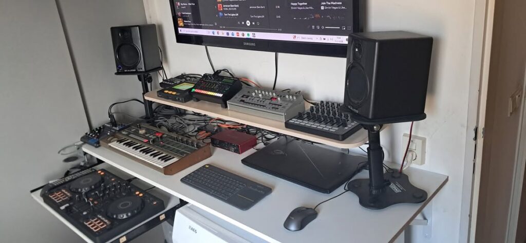 The next step is to ensure your studio monitors are at the correct ear level. Small stands or foam pads commonly feature in this layout to reduce unwanted desk vibrations. It is also clear that a large monitor screen helps you see your DAW more clearly. Keeping your most used gear in the center helps you stay in the sweet spot.