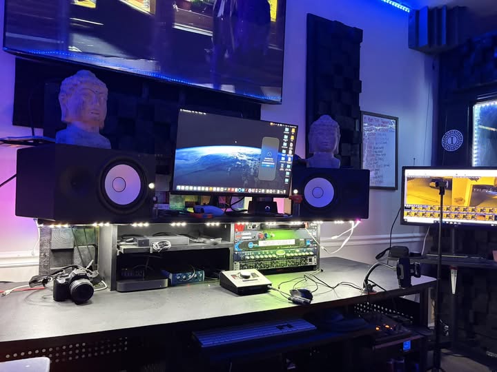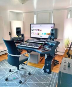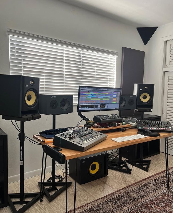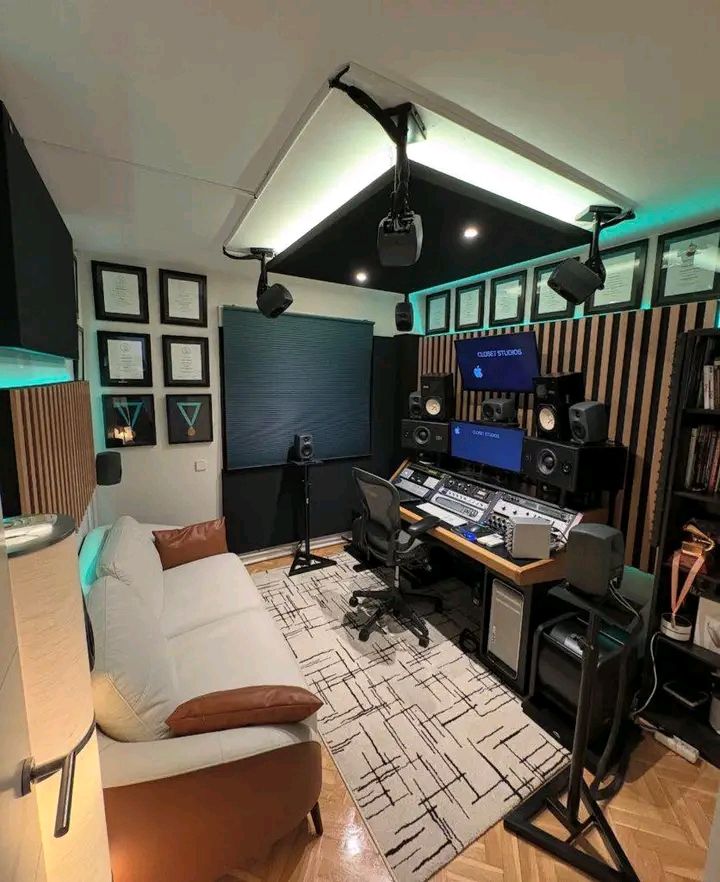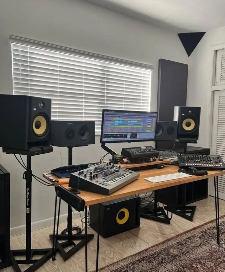 Powerful audio workspaces commonly feature KRK Rokit monitors, drum machines, and mixing consoles. Acoustic panels are arranged to optimize sound quality. Rugs or decorative elements may balance technical precision with style.