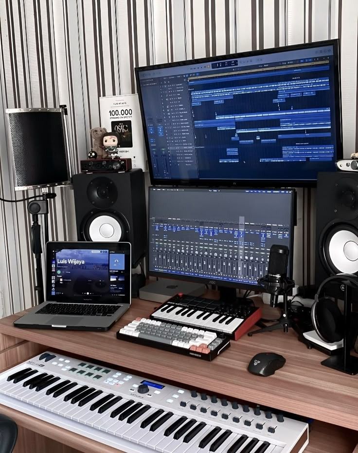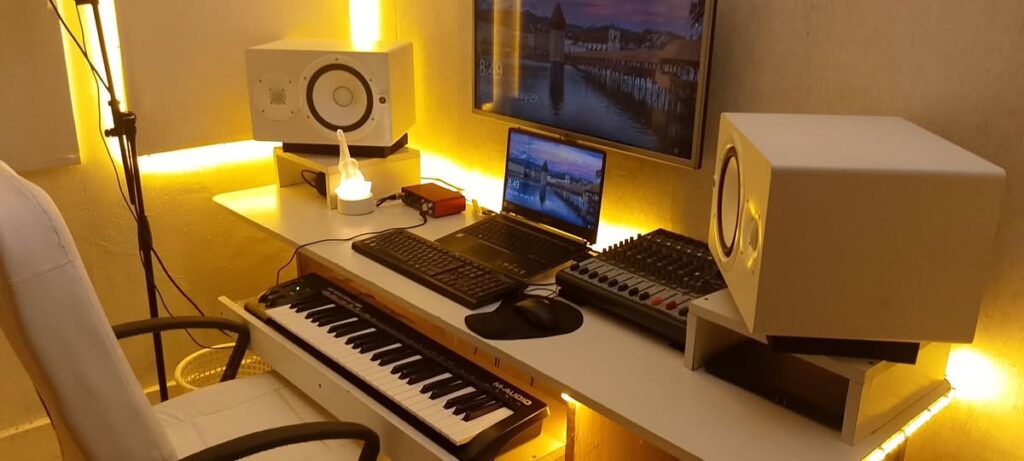Modern studio desks often feature LED lighting, clean layouts, and MIDI keyboards. Audio mixers and microphones may be placed for easy access. Decorative items can add personality to the professional setup.