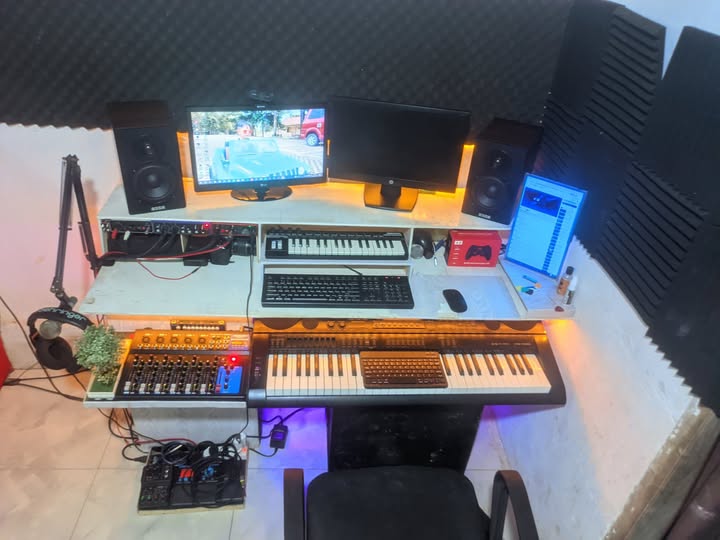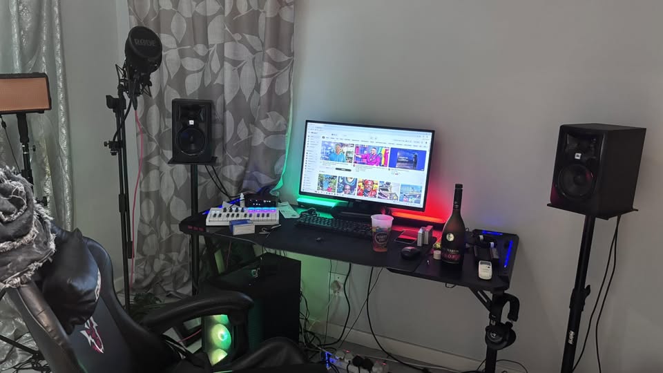 Lifestyle studio setups may include YouTube on screen, RGB lighting, and personal items. Music controllers and microphones often complement the multimedia environment. The layout blends creativity with everyday comfort.