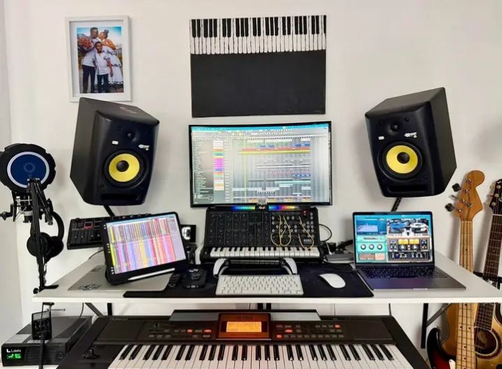 Comprehensive home studios may include bass guitars, digital pianos, and DAW interfaces. Family photos or wall art often personalize the space. The layout emphasizes versatility and creativity.