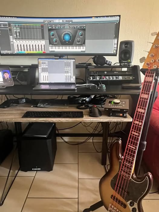 Curved monitor setups may include laptops, tablets, and bass guitars. Studio monitors and audio interfaces often support the workflow. The layout emphasizes organization and versatility.